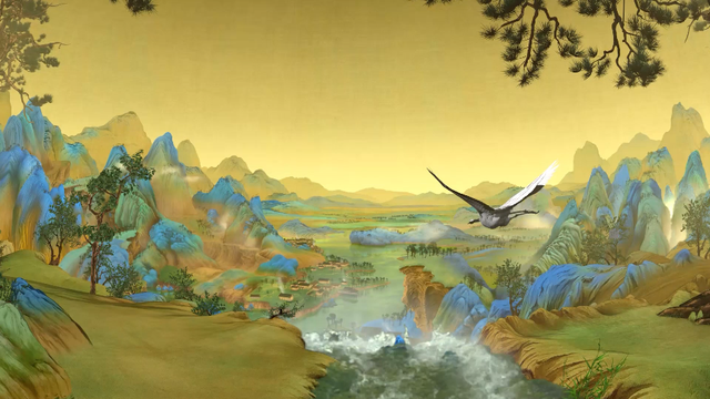 我想到宋徽宗有一幅著名的作品《瑞鶴圖》,于是就加入了“仙鶴帶領觀眾飛翔”這一創意,在影片一開始首先展現了《瑞鶴圖》的畫面,進入北宋的宮殿,隨后的飛翔鏡頭就是模擬仙鶴的視角,飛入畫中引領觀眾一路飛翔。這個創意很重要,它串聯了三個關鍵要素,一是仙鶴引領觀眾飛翔,強調了方特球幕飛翔影院的特點;二是《千里江山圖》,這幅畫本身沒有仙鶴,但是翩翩白鶴飛翔在青綠色調的千里江山中,江山因此而變得生機勃勃;三是帶出了宋徽宗這一歷史人物,他是《千里江山圖》的指導老師,十分喜歡仙鶴。所以仙鶴的創意貫穿影片始終,使整個故事更加完整,主題更加突出。